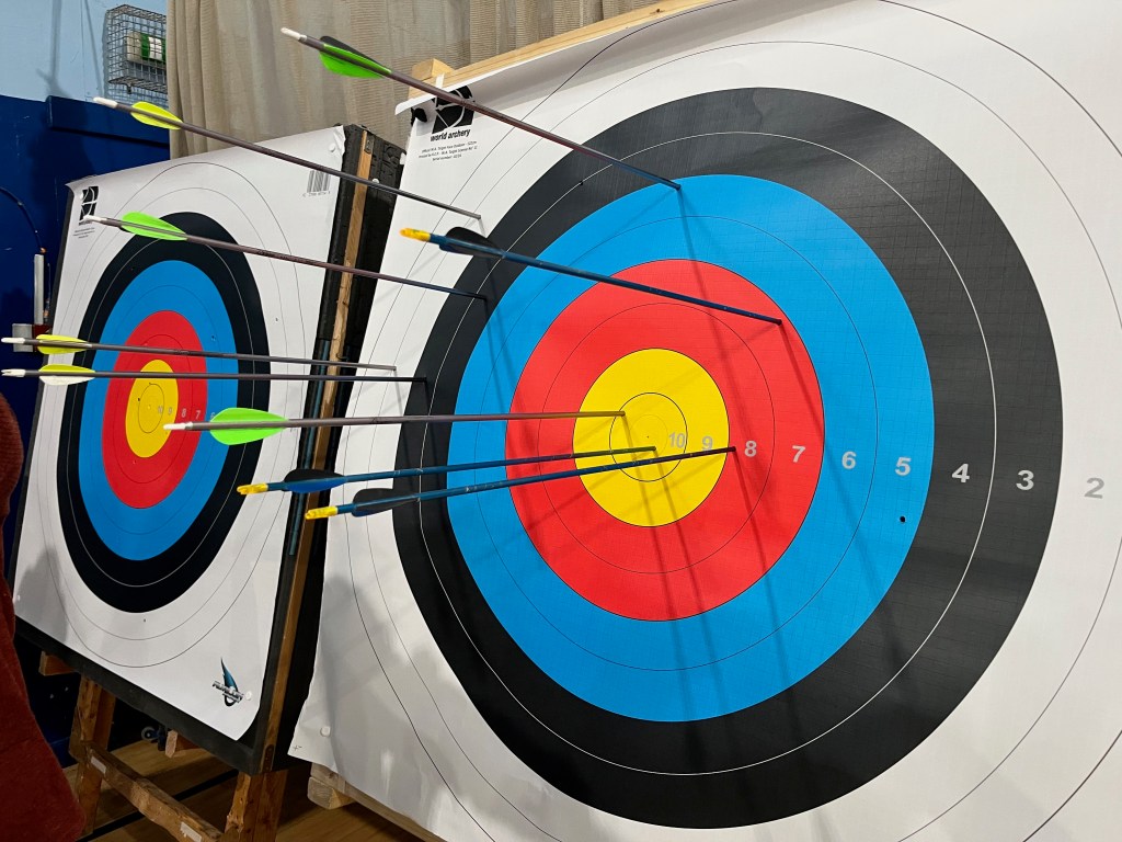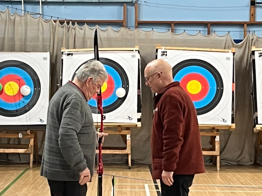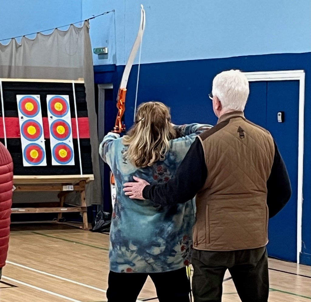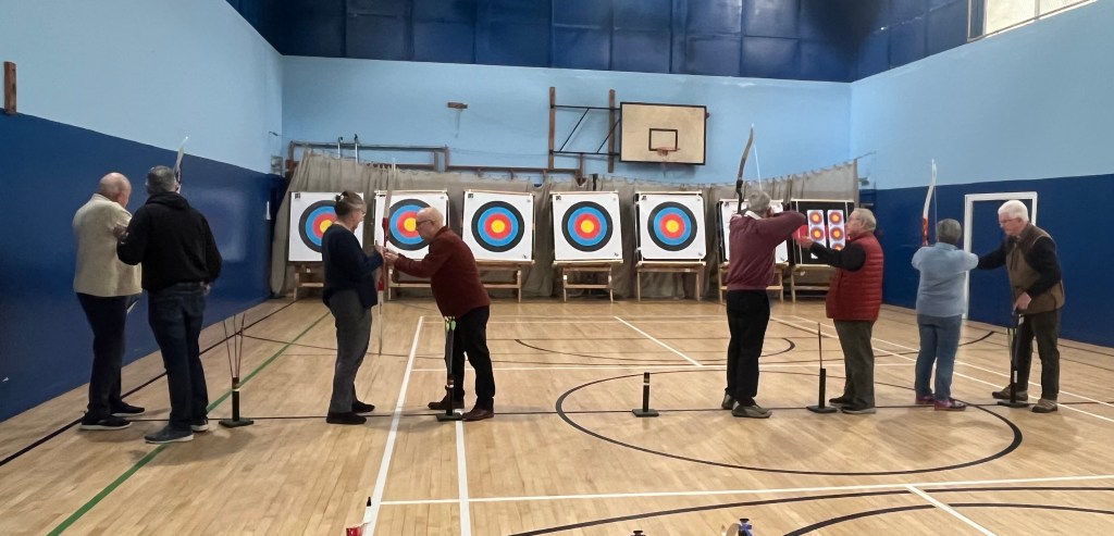 Some of us maintained a level of good shooting , others were a bit erratic, but nobody disgraced themselves. Collecting our arrows from the other end of the room, it was fascinating to see where we had hit the target and how we’d scored.