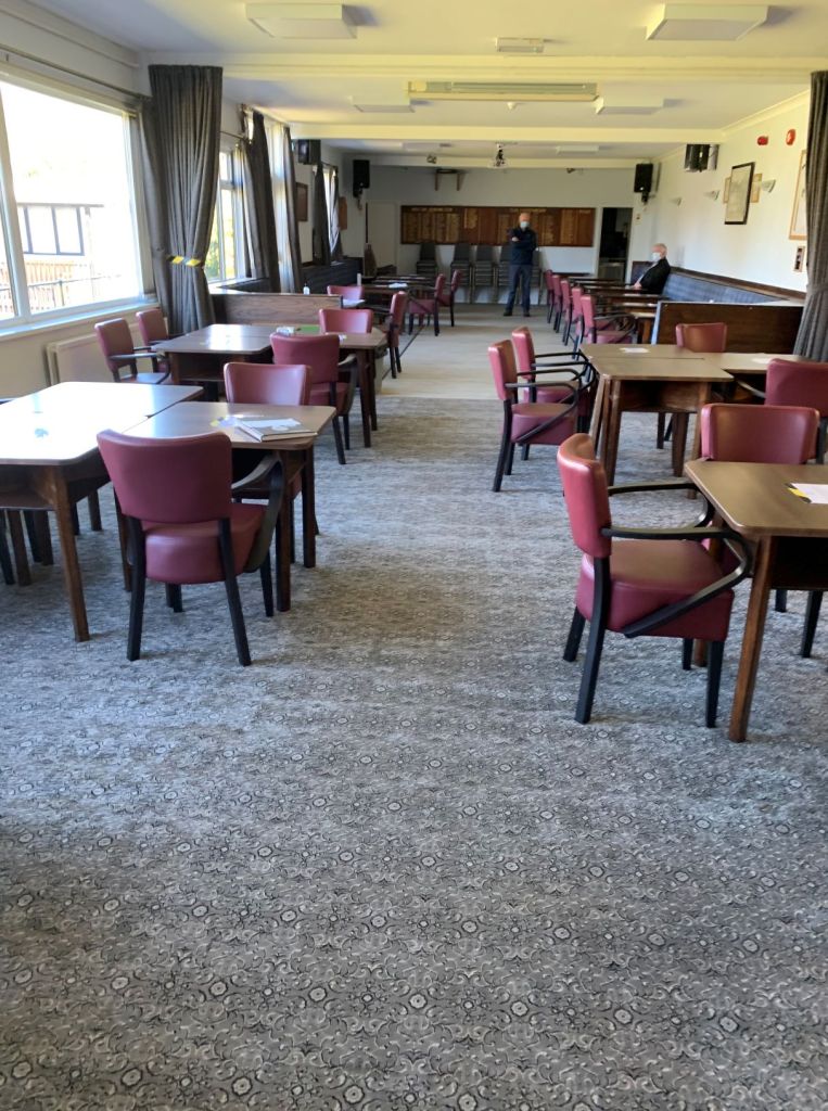 2021: John Carter and Iain Fulton visit W End Bowling Club to check on its suitability for Probus meetings.